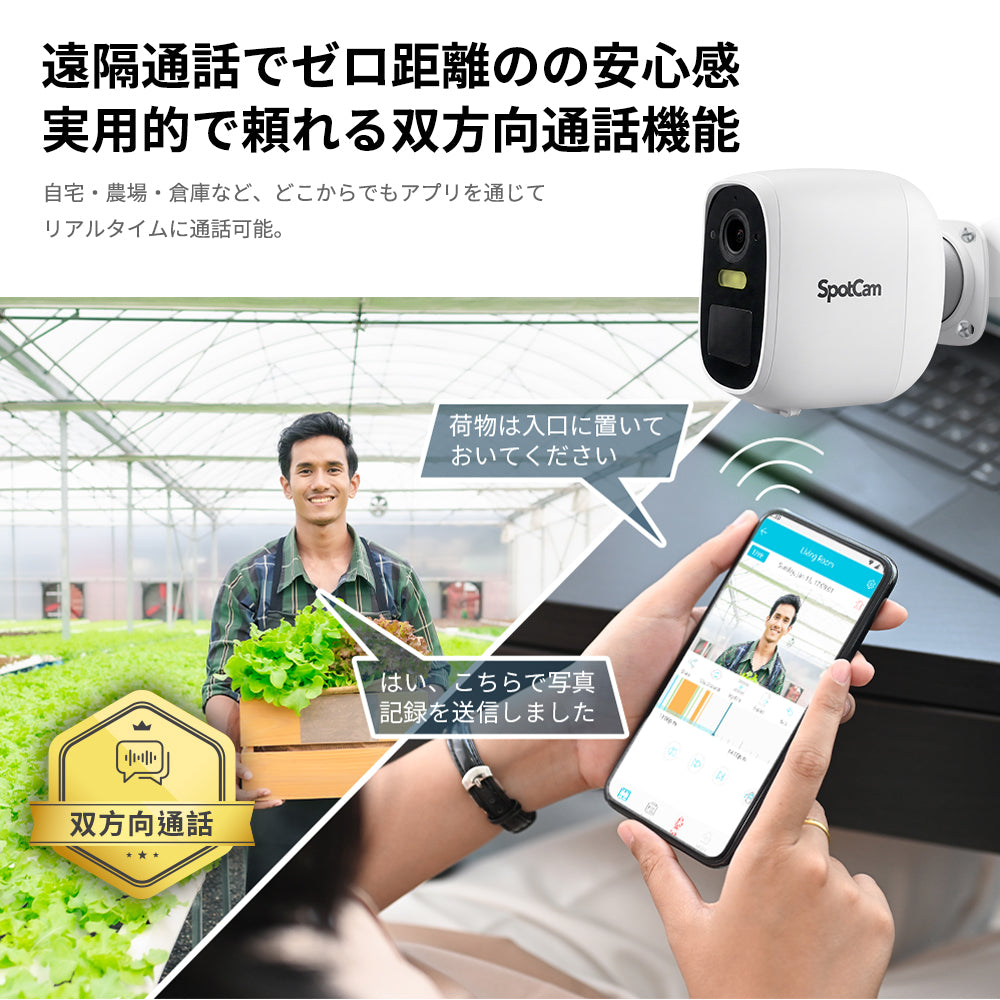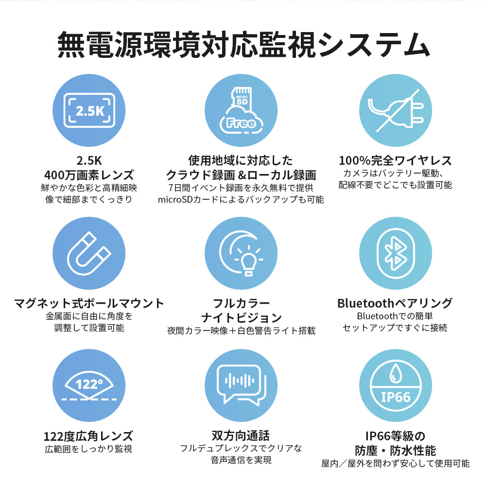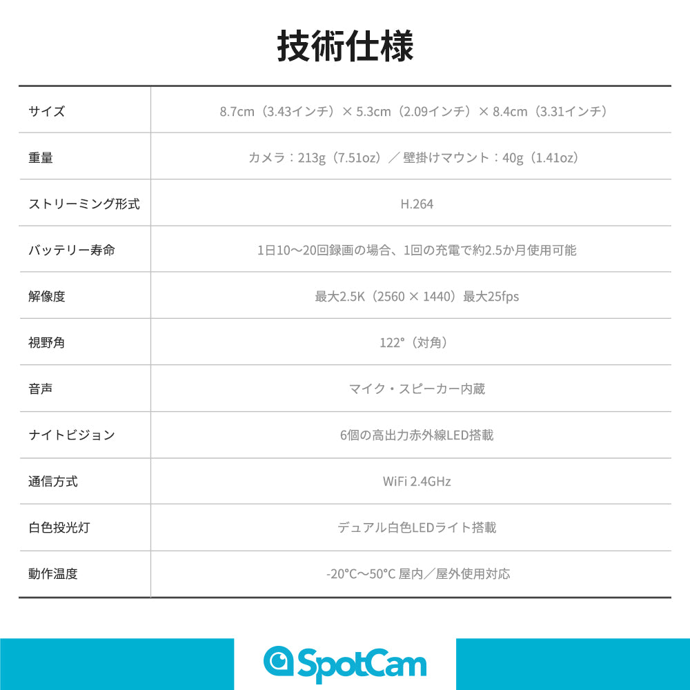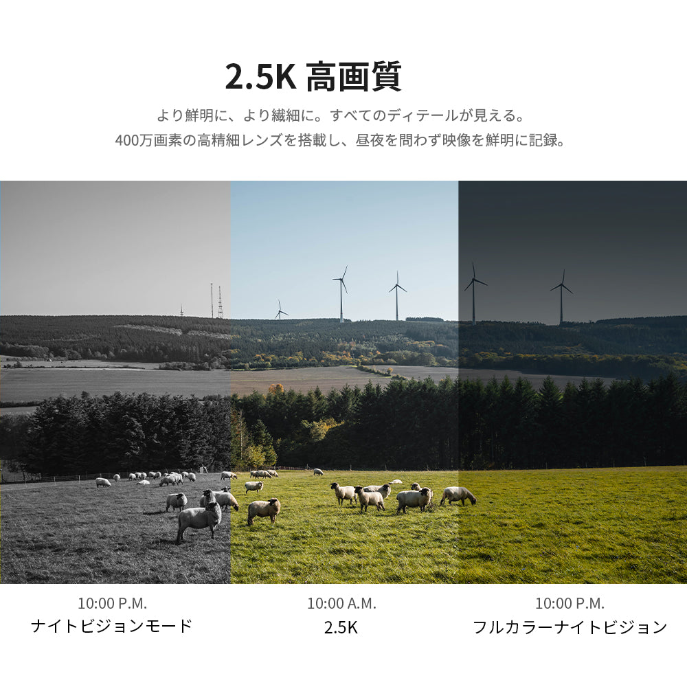 - 高解像度2.5K・400万画素レンズ、完全ワイヤレスバッテリーカメラ
